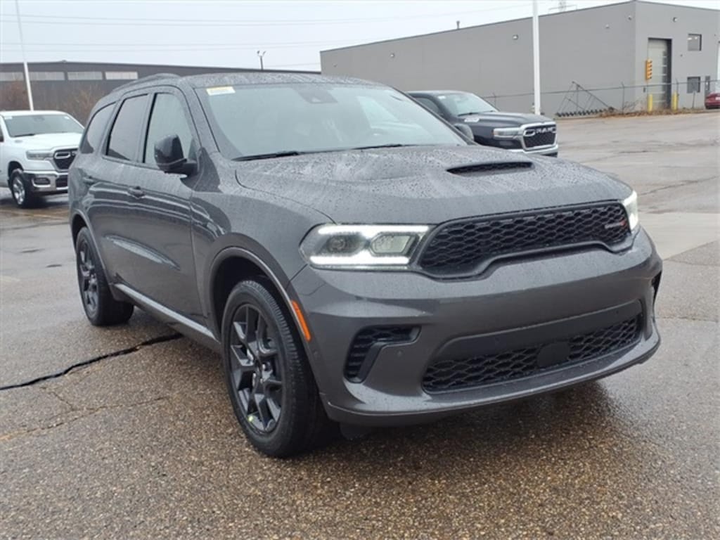 Vapor Gray 2026 Dodge Durango GT Plus HEMI V8 AWD 8-Speed Automatic HEMI 5.7L V8 Multi Displacement VVT AWD, 115V Auxiliary Power Outlet, 3.09 Rear Axle Ratio, 3rd row seats: split-bench, 4-Wheel Disc Brakes, 7 & 4 Pin Wiring Harness, 9 Speakers, ABS brakes, Adaptive Cruise Control w/Stop, Air Conditioning, Alloy wheels, AM/FM radio: SiriusXM w/360L, Apple CarPlay/Android Auto, Auto High Beam Headlamp Control, Auto-Dimming Exterior Driver Mirror, Auto-dimming Rear-View mirror, Auto-leveling suspension, Automatic temperature control, Black Roof Rails, Blacktop Package, Blind Spot w/Trailer Detection, Brake assist, Bumpers: body-color, Class IV Receiver Hitch, Cloth Bucket Seats w/Shift Insert, Compass, Delay-off headlights, Driver door bin, Driver vanity mirror, Dual front impact airbags, Dual front side impact airbags, Dual Remote USB Port - Charge Only, Electronic Stability Control, Emergency communication system: Dodge Connect, Exterior Mirrors w/Heating Element, Exterior Mirrors w/Memory, Exterior Mirrors w/Supplemental Signals, Floor Console w/Leather Armrest, Four wheel independent suspension, Front anti-roll bar, Front Bucket Seats, Front Center Armrest w/Storage, Front dual zone A/C, Front reading lights, Full Speed Forward Collision Warning Plus, Fully automatic headlights, Garage door transmitter, Gloss Black Badges, Gloss Black Exterior Mirrors, Heated door mirrors, Heated front seats, Heated Second Row Seats, Heated steering wheel, Illuminated entry, Integrated Roof Rail Crossbars, Knee airbag, Leather steering wheel, Leather Trimmed Bucket Seats, Leather Wrapped Door Panels, LED Auxiliary Low Beam & Turn Signal, Low tire pressure warning, Navigation System, Occupant sensing airbag, Outside temperature display, Overhead airbag, Overhead console, Panic alarm, ParkView Rear Back-Up Camera, Passenger door bin, Passenger vanity mirror, Power 6x9 Multi-Function Foldaway Mirrors, Power 8-Way Driver Memory 8-Way Passenger Seats, Power door mirrors, Power driver seat, Power Driver/Passenger 4-Way Lumbar Adjust, Power Liftgate, Power steering, Power Sunroof, Power Tilt & Telescopic Steering Column, Power windows, Quick Order Package 22T GT Plus, Radio data system, Radio: Uconnect 5 Nav w/10.1" Display, Radio/Driver Seat/Mirrors Memory, Rain sensing wipers, Rear air conditioning, Rear anti-roll bar, Rear Load Leveling Suspension, Rear reading lights, Rear seat center armrest, Rear window defroster, Rear window wiper, Red Accent Stitching, Remote keyless entry, Satin Black Dodge Tail Lamp Badge, Security system, Speed control, Speed-sensing steering, Speed-Sensitive Wipers, Split folding rear seat, Spoiler, Sport steering wheel, Steering wheel mounted audio controls, Tachometer, Telescoping steering wheel, Tilt steering wheel, Traction control, Trailer Brake Control, Trip computer, Variably intermittent wipers, Ventilated Front Seats, Voltmeter, Wheels: 20" x 8" Black Noise Split 5-Spoke, Wheels: 20" x 8" Satin Carbon Split 5-Spoke, AWD. Price includes: $1500 - 2026 Midwest BC Regional Bonus Cash . Exp. 01/05/2026
